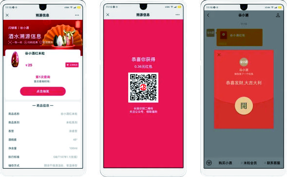 消费者查询真伪时,可获得固定额度或随机额度红包,增加消费乐趣,促进重复消费及转介绍客户!